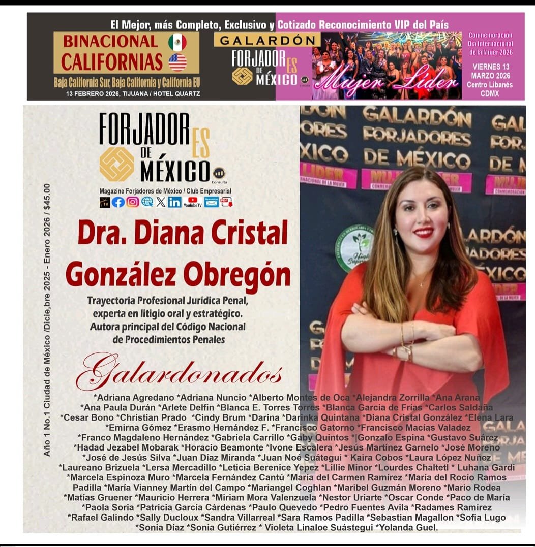 • La Dra. Diana Cristal González Obregón ha sido varias veces portada de las revistas más destacadas en materia jurídica. Ha sido reconocida como MUJER LÍDER 2025 por el destacado grupo FORJADORES DE MÉXICO y ha sido reconocida también como mujer en 2025 por su destacada trayectoria profesional por la Asociación Mexicana de Contadores Públicos, Colegio Profesional en la Ciudad de México; madre, hija, pareja y hermana, agradecida de todas las bendiciones de Dios del amado país que amo con todo mi ser, mi México, mi tierra.